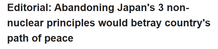 社论文章同时说,作为世界上唯一曾遭到原子弹轰炸的国家,日本若放弃“无核三原则”,不仅将引起邻国的反对,更直接违背在原子弹轰炸中幸存者的意愿。日本原子弹和氢弹受害者组织联合会执行董事田中聪批评称,“这相当于否定了前辈多年来的一贯努力”。